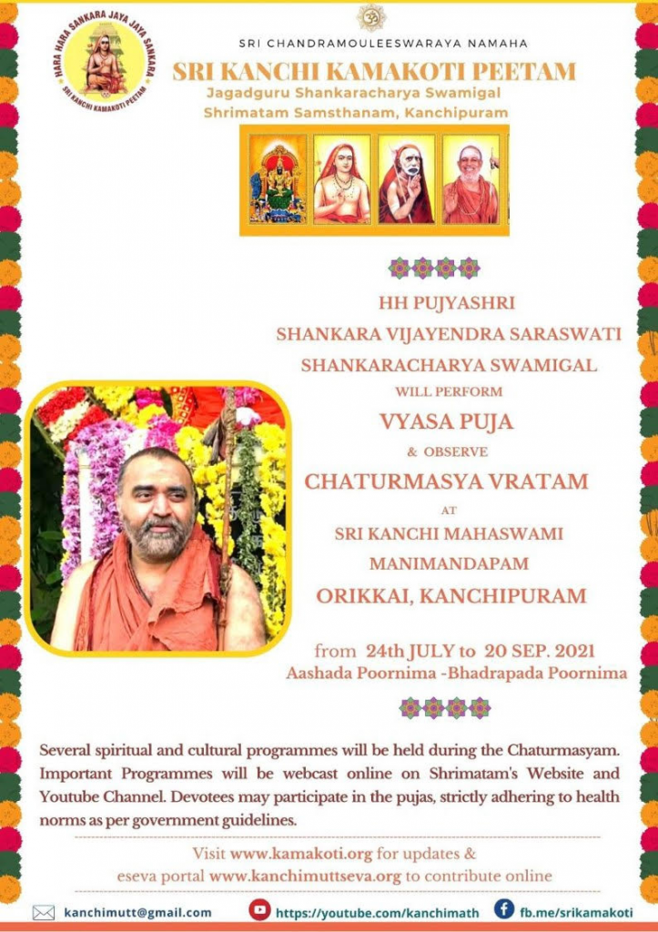 PujyaShri Periyava is observing Chaturmaasya Vratham from *24th July 2021 to 20th September 2021* at Orirukkai Mani Mandapam Kanchipuram. It is a tradition where shishyaas do Bhikshavandanam during Chaturmaasya kaalam to sanyaasis.