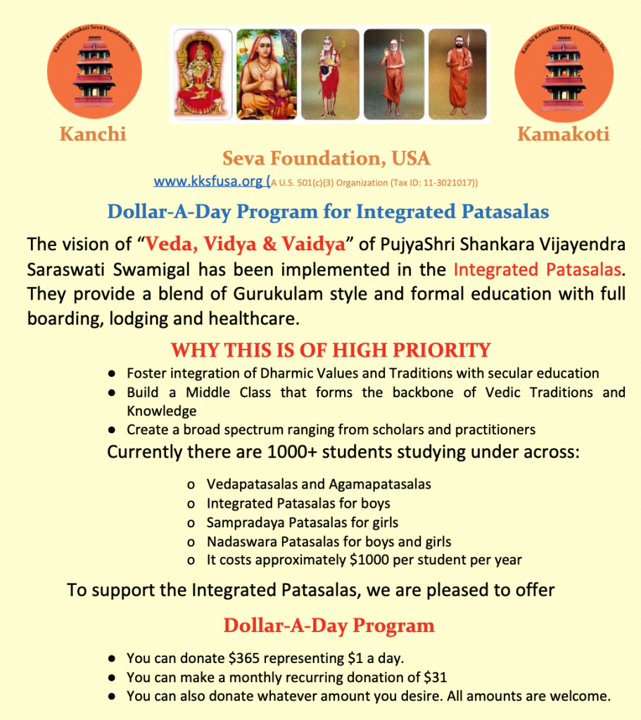 The dollar-a-day scheme supports the 3V ‘s vision of Pujyasri Periayava, namely Veda, Vidya and Vaidya